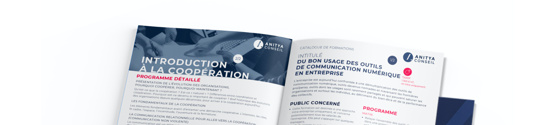 ANITYA CONSEIL vous propose des formations en intra et inter entreprises, avec un équilibre entre apports théoriques et mises en pratiques, et la possibilité d’un design sur mesure pour votre organisation en fonctions de vos attentes, de votre contexte et de votre culture d’entreprise.